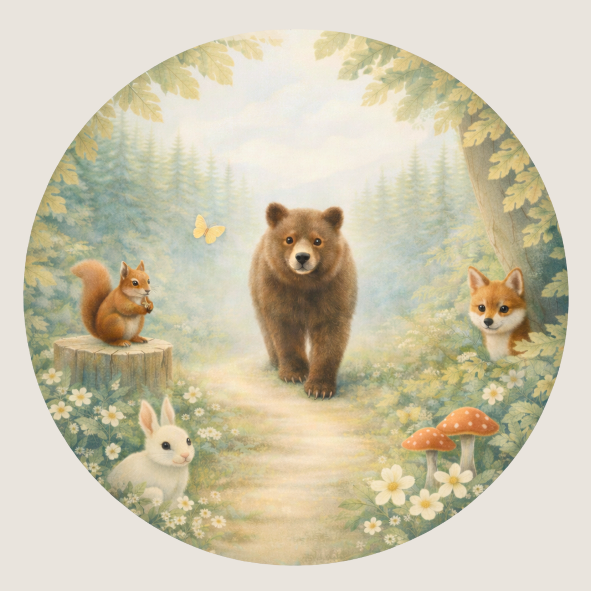Een sfeervolle, ronde muursticker met een zachte illustratie van bosdieren. De beer staat centraal, omringd door andere bosdieren en natuurlijke elementen. Een rustig en warm beeld dat perfect past in de baby- of kinderkamer.