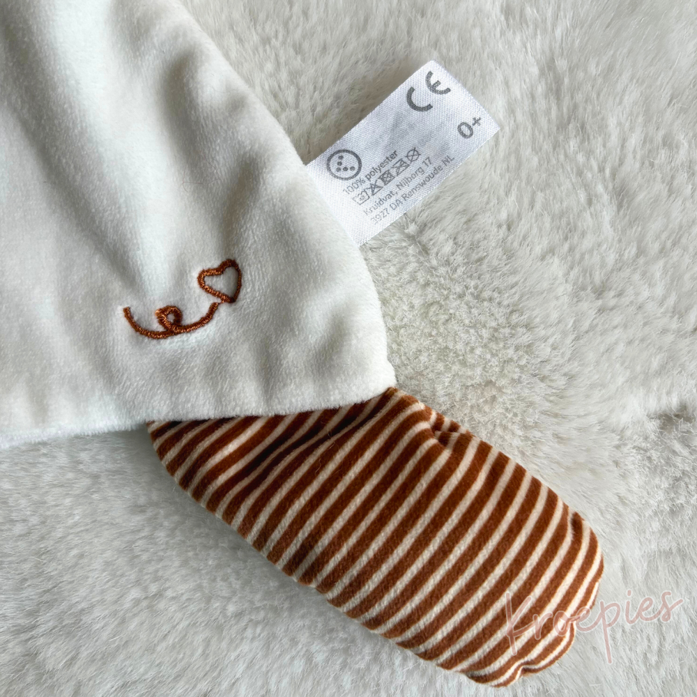 Dit Evora knuffeldoekje konijn van het Kruidvat concern is verkrijgbaar in de kleur wit met bruine streepjes op zijn knisperoortjes en klaar voor een nieuw avontuur.