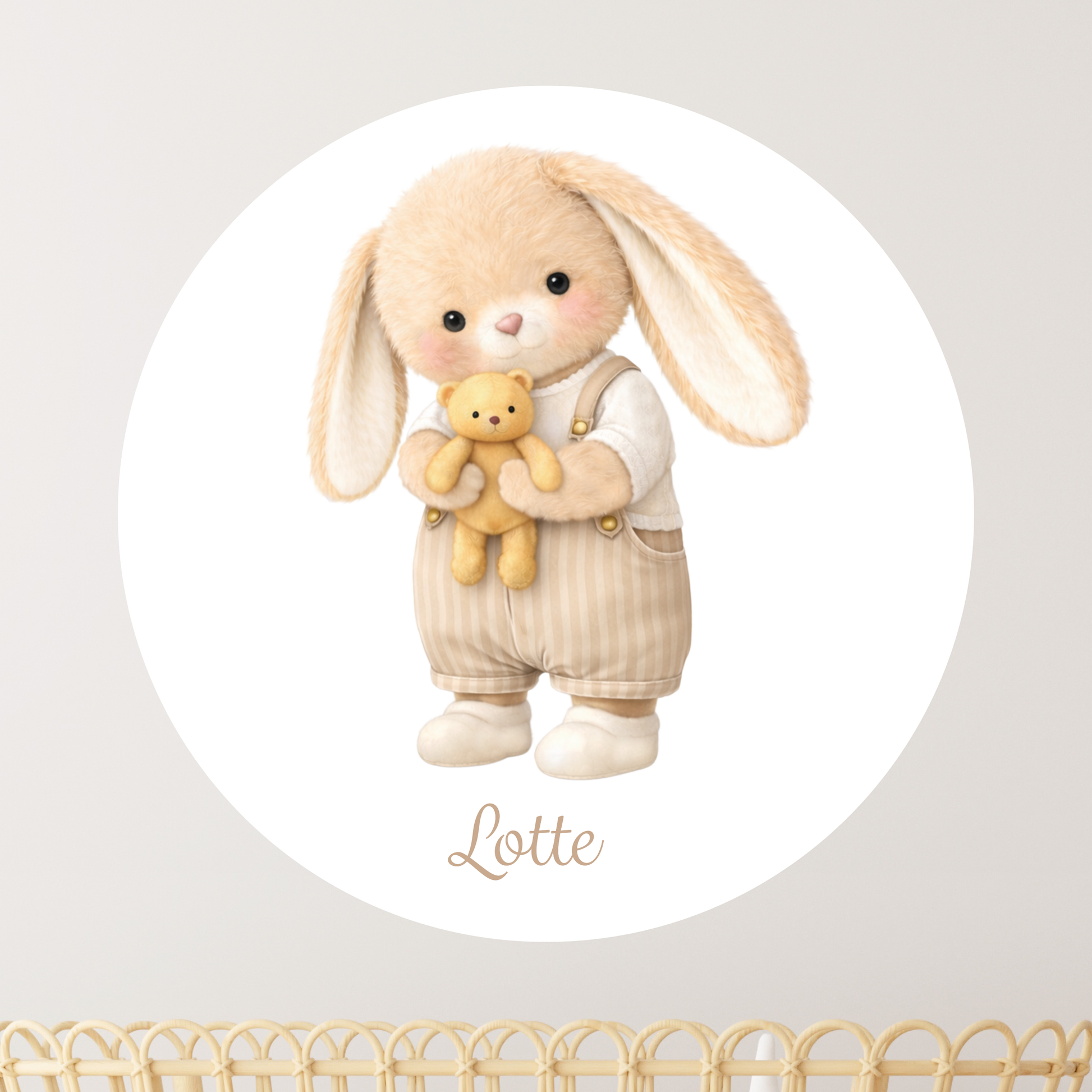 Een ronde muursticker met een lief konijntje dat zijn knuffel vasthoudt. Een rustig en vertrouwd beeld voor de baby- of kinderkamer.